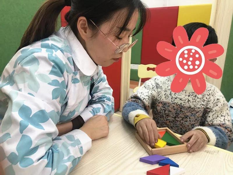 在专注力课的尾声,梦梦老师安排奇奇拼七巧板,她先让奇奇认真观察图形,然后把示意图盖了起来。